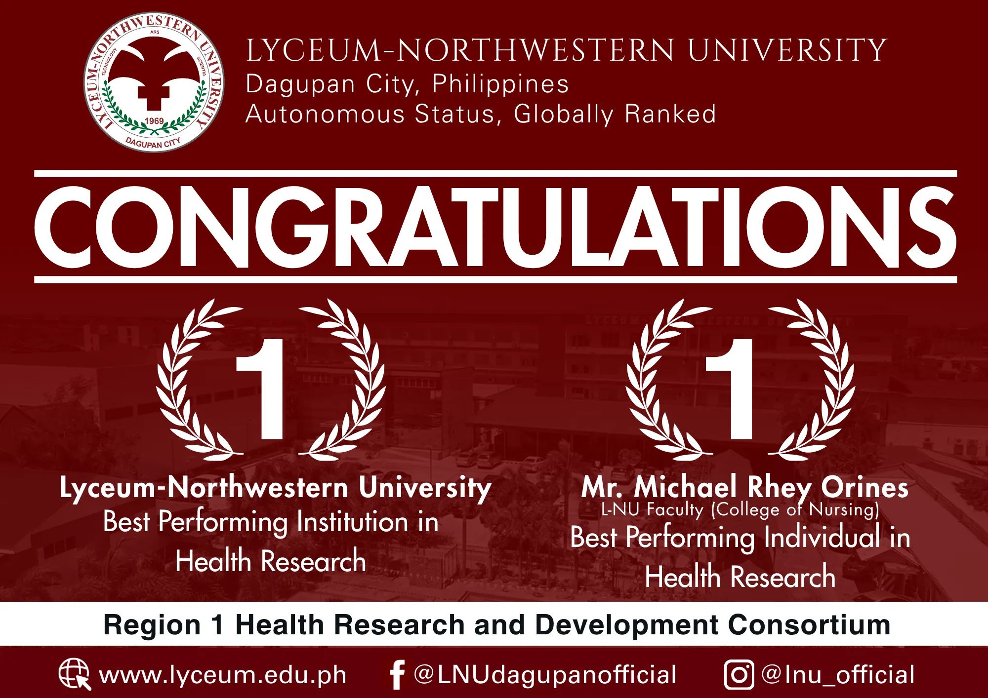 𝗟-𝗡𝗨 was recognized as 𝗕𝗲𝘀𝘁 𝗣𝗲𝗿𝗳𝗼𝗿𝗺𝗶𝗻𝗴 𝗜𝗻𝘀𝘁𝗶𝘁𝘂𝘁𝗶𝗼𝗻 𝗶𝗻 𝗛𝗲𝗮𝗹𝘁𝗵 𝗥𝗲𝘀𝗲𝗮𝗿𝗰𝗵, while 𝗠𝗿. 𝗠𝗶𝗰𝗵𝗮𝗲𝗹 𝗥𝗵𝗲𝘆 𝗢𝗿𝗶𝗻𝗲𝘀 (L-NU faculty – College of Nursing) was honored as 𝗕𝗲𝘀𝘁 𝗣𝗲𝗿𝗳𝗼𝗿𝗺𝗶𝗻𝗴 𝗜𝗻𝗱𝗶𝘃𝗶𝗱𝘂𝗮𝗹 𝗶𝗻 𝗛𝗲𝗮𝗹𝘁𝗵 𝗥𝗲𝘀𝗲𝗮𝗿𝗰𝗵.