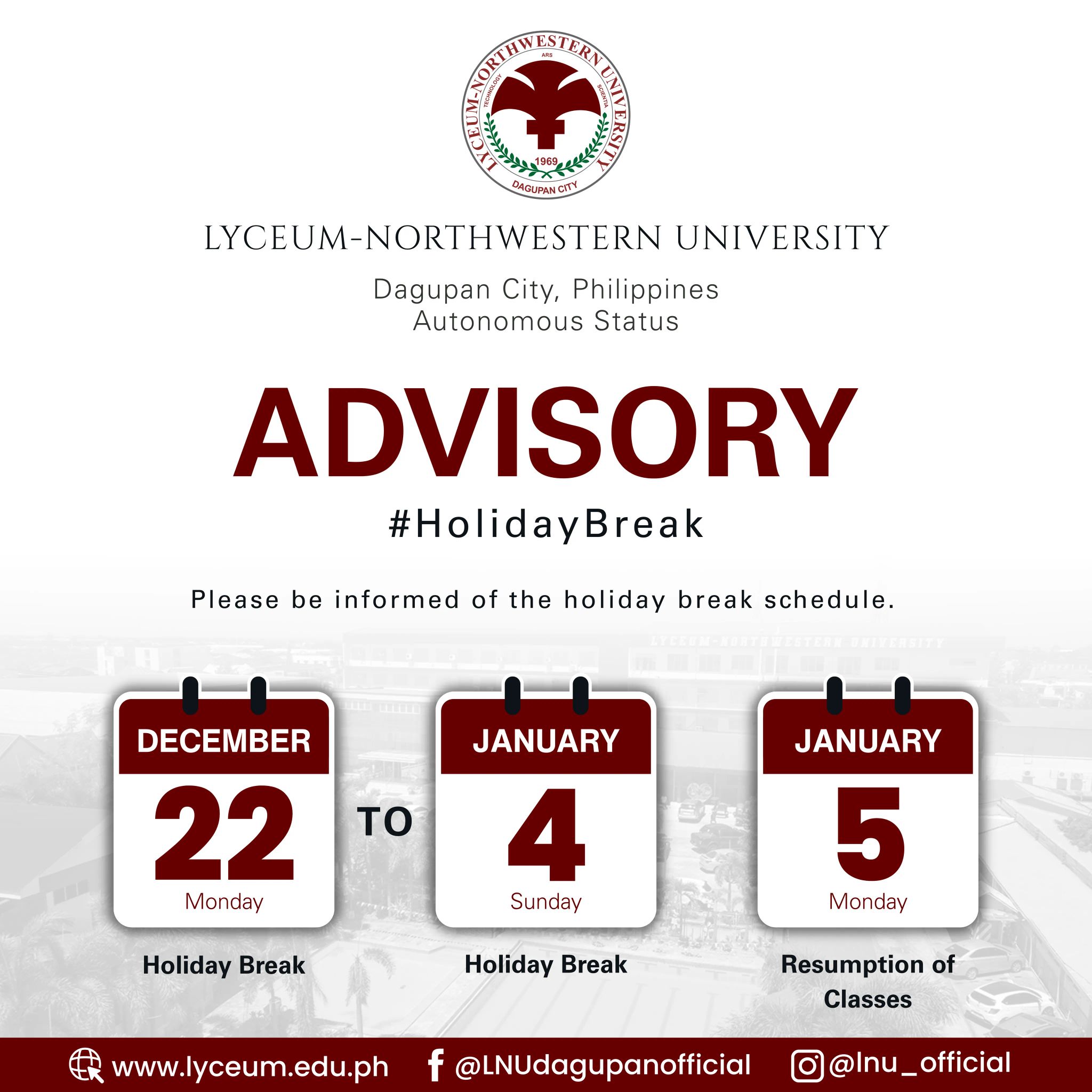 𝗔𝗗𝗩𝗜𝗦𝗢𝗥𝗬 | 𝗛𝗢𝗟𝗜𝗗𝗔𝗬 𝗕𝗥𝗘𝗔𝗞 Please be informed of the Holiday Break Schedule for students, Lyceans: 📅 December 22 to January 4, 2025 – Holiday Break📅 January 5, 2025 – Resumption of Classes Enjoy a restful and meaningful holiday break. Classes will resume as scheduled.