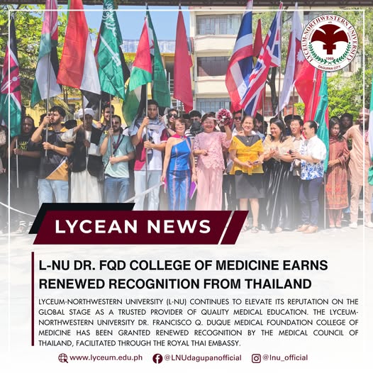 Lyceum-Northwestern University (L-NU) continues to elevate its reputation on the global stage as a trusted provider of quality medical education. The Lyceum-Northwestern University Dr. Francisco Q. Duque Medical Foundation College of Medicine has been granted renewed recognition by the Medical Council of Thailand, facilitated through the Royal Thai Embassy.