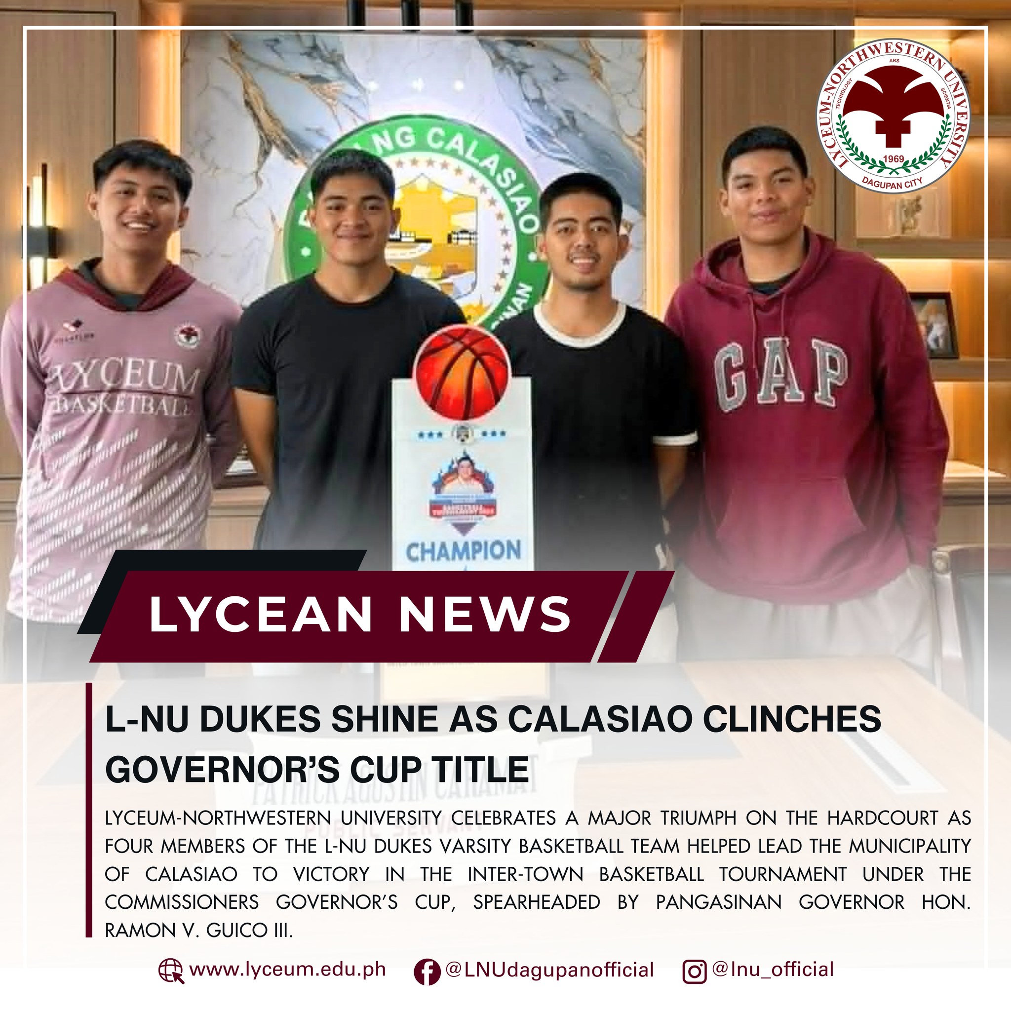 Lyceum-Northwestern University celebrates a major triumph on the hardcourt as four members of the L-NU Dukes varsity basketball team helped lead the Municipality of Calasiao to victory in the Inter-Town Basketball Tournament under The Commissioners Governorโs Cup, spearheaded by Pangasinan Governor Hon. Ramon V. Guico III.
