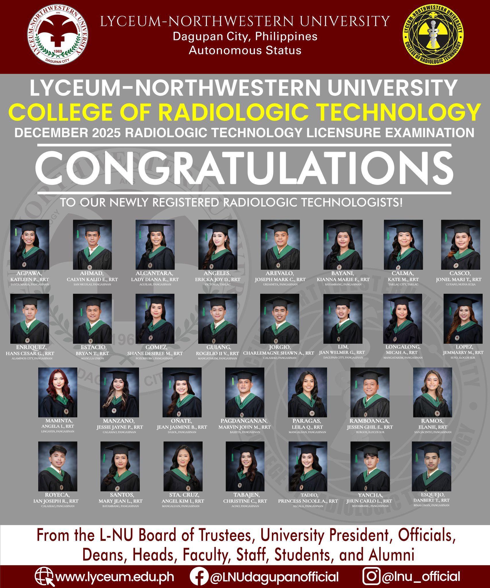 The Lyceum-Northwestern University College of Radiologic Technology proudly celebrates the success of its passers in the December 2025 Radiologic Technology Licensure Examination. This achievement reflects dedication, competence, and excellence in the field of medical imaging.
