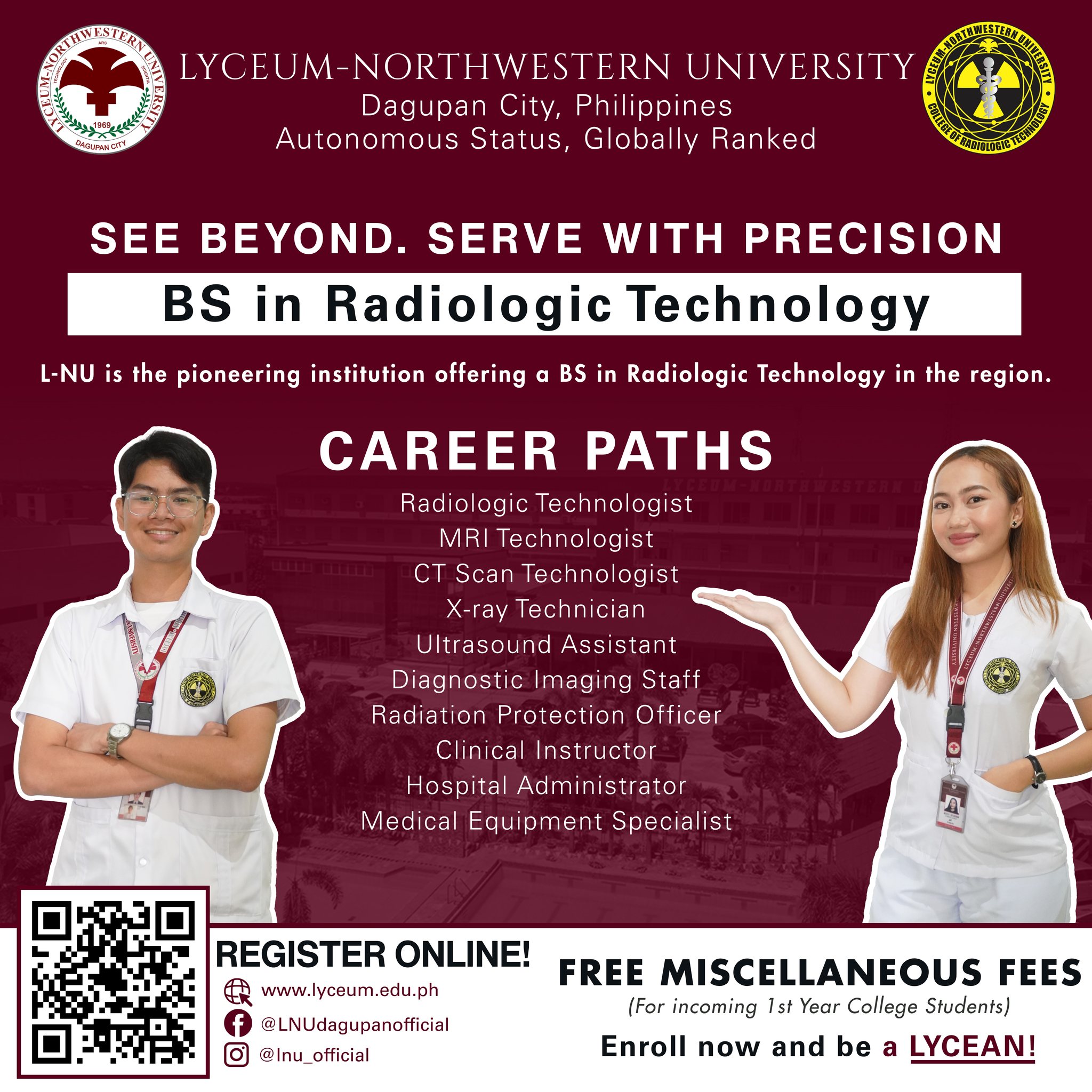 Lyceum-Northwestern University is a pioneering institution in the region offering the ๐๐ฆ ๐ถ๐ป ๐ฅ๐ฎ๐ฑ๐ถ๐ผ๐น๐ผ๐ด๐ถ๐ฐ ๐ง๐ฒ๐ฐ๐ต๐ป๐ผ๐น๐ผ๐ด๐โpreparing students for dynamic careers in diagnostic imaging, healthcare, and medical technology.