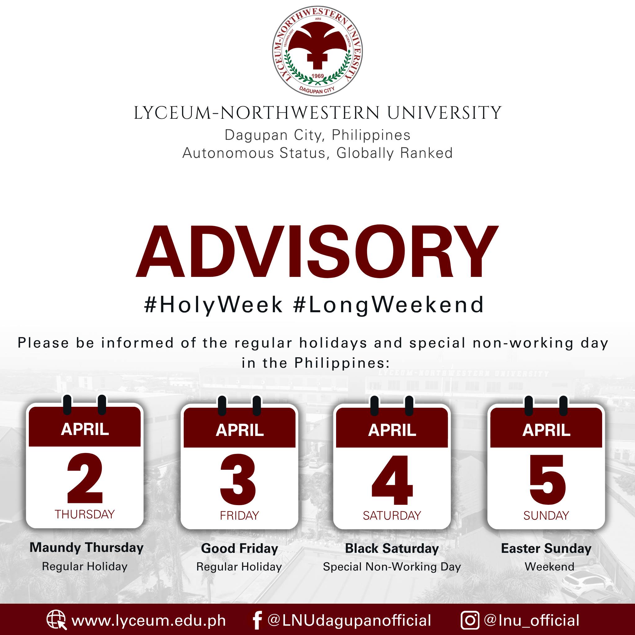 Lyceum-Northwestern University informs its students, faculty, staff, and stakeholders that pursuant to Proclamation No. 1006 issued by Malacañang Palace, the following dates are declared in observance of the Holy Week: