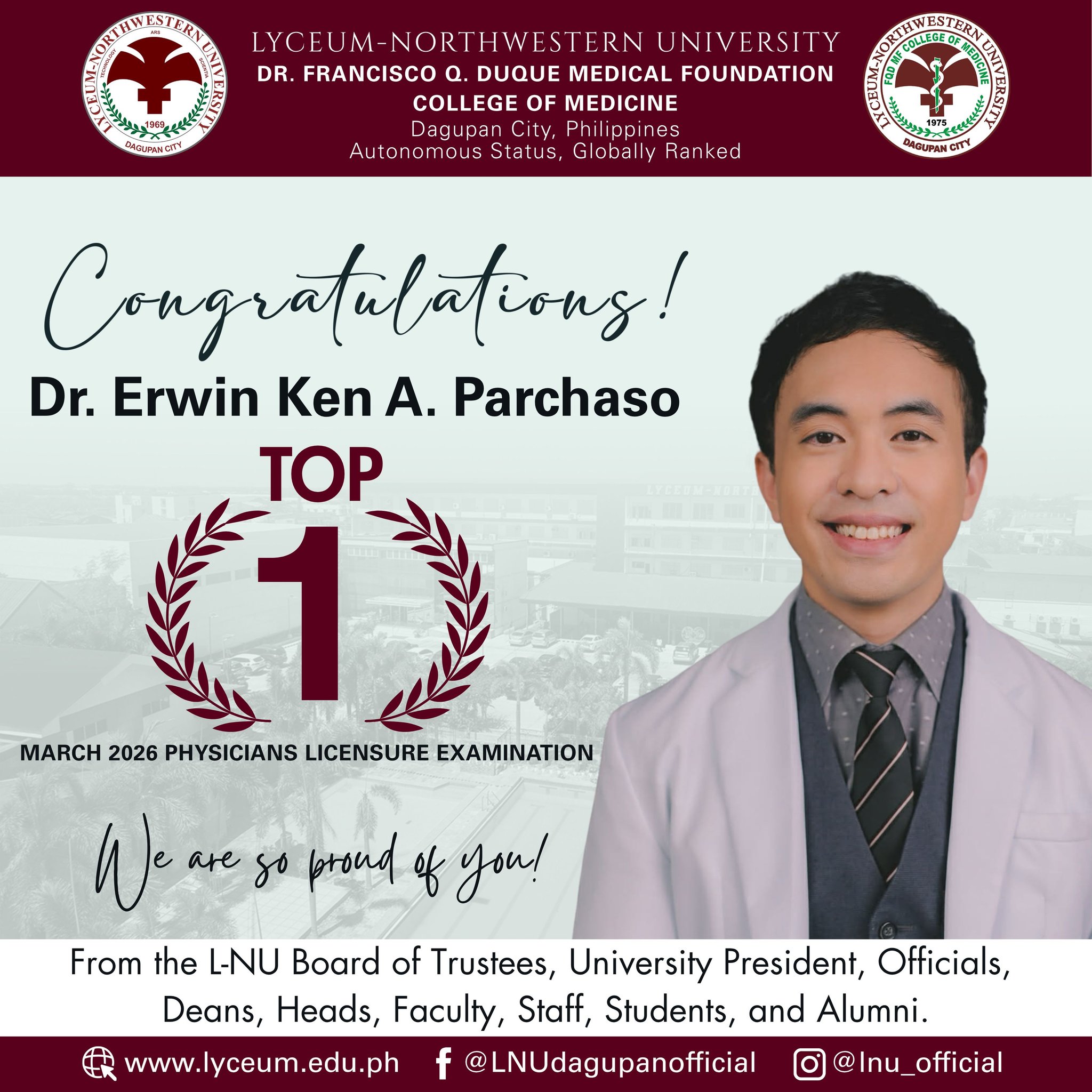 Lyceum-Northwestern University Dr. Francisco Q. Duque College of Medicine proudly celebrates ๐๐ฟ. ๐๐ฟ๐๐ถ๐ป ๐๐ฒ๐ป ๐. ๐ฃ๐ฎ๐ฟ๐ฐ๐ต๐ฎ๐๐ผ for achieving ๐ง๐ผ๐ฝ ๐ญ in the March 2026 Physicians Licensure Examination.